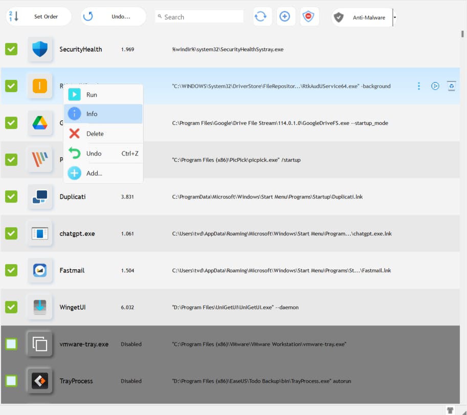 Je weet nu precies hoeveel impact elke app heeft op de totale opstarttijd. In BootRacer kun je deze apps niet alleen tijdelijk uitschakelen, maar ook de startvolgorde aanpassen. Open het onderdeel Startup Control voor een overzicht. Verwijder het vinkje om apps uit te schakelen. Klik je met rechts op een app, dan kies je Info om het pad naar het programma te zien of eventueel Delete als je de opstartverwijzing (in het register) helemaal wilt verwijderen. Met de knop Set Order links bovenin bepaal je via de pijlknoppen welke apps eerder of juist later starten. Bevestig je wijzigingen met Finish Reordering.