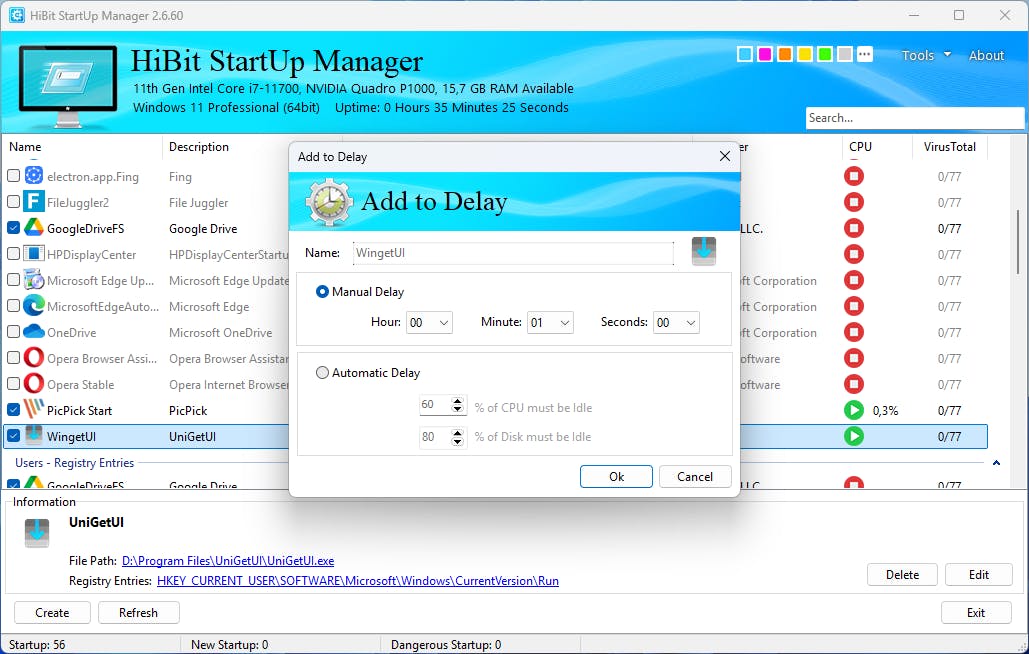 In BootRacer kun je het opstarten van specifieke apps niet uitstellen om sneller je bureaublad te zien, omdat de app pas daarna wordt gestart. Dat kan wel met de gratis HiBit start-up Manager (www.hibitsoft.ir/StartupManager.html). Kies bij voorkeur voor de installeerbare versie, want de portable editie mist enkele opties. Installeer de app en start deze op. Wil je een app later laten opstarten, klik er dan met rechts op, kies Add to Delay en stel de gewenste vertraging in (Hour, Minute, Seconds). Of kies Automatic Delay en bepaal hoeveel procent cpu- en/of schijfbelasting er maximaal mag zijn voordat de app start. Bevestig met OK.