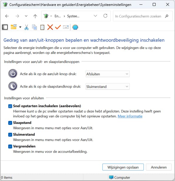 Je beheert dit via de ingebouwde app Configuratiescherm. Ga naar Systeem en beveiliging / Energiebeheer, klik op Het gedrag van de aan/uit-knoppen bepalen en kies Instellingen wijzigen die momenteel niet beschikbaar zijn. Zet een vinkje bij Snel opstarten inschakelen (aanbevolen) en bevestig met Wijzigingen opslaan.