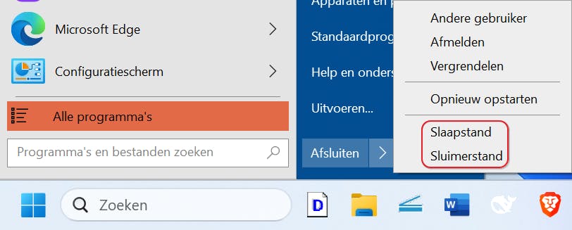 Bij Sluimerstand (hibernate) schrijft Windows de volledige inhoud van het RAM naar schijf, zodat de pc geen stroom meer nodig heeft. Bij het opstarten hervat je de sessie exact waar je gebleven was, inclusief geopende programma’s. Nog sneller is Slaapstand, waarbij de sessie in het RAM-geheugen blijft, waardoor de pc wel nog een klein beetje stroom verbruikt.