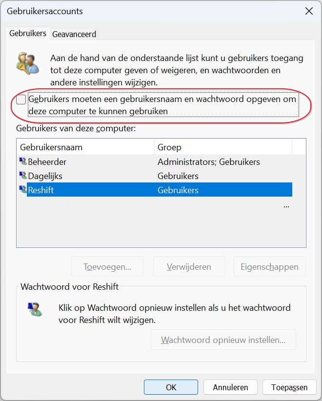 Druk op Windows-toets+R, typ netplwiz en klik op OK. Verwijder het vinkje bij Gebruikers moeten een gebruikersnaam en wachtwoord opgeven […]. Bevestig met OK en vul het wachtwoord in van het gewenste account.