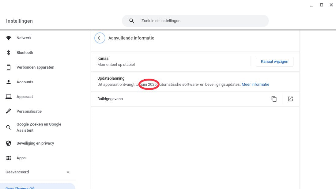 Het maakt kopen van een tweedehands Chromebook via bijvoorbeeld Marktplaats bovendien risky. Grote kans dat de verkoper het apparaat van de hand doet omdat de ondersteuningsperiode verstreken of bijna verstreken is. Geeft een verkoper je geen duidelijk antwoord hierover, zet dan de Chromebook aan. Klik op de het vlakje met de klok, rechtsonder in beeld. Klik in het geopende paneel weer op ’t tandwiel. Klik in het geopende venster in de kolom links op Over Chrome OS en dan aan de rechterkant op Aanvullende informatie. Je ziet daar nu onder het kopje Updateplanning precies vermeld tot wanneer de Chromebook ondersteund wordt. Aan de hand van de daar genoemde datum kun je voor jezelf beslissen of een aangeboden Chromebook de prijs waard is. Voor iets dat nog minder dan een jaar ‘houdbaar’ is, adviseren we je nog even verder te kijken naar een alternatief aanbod.