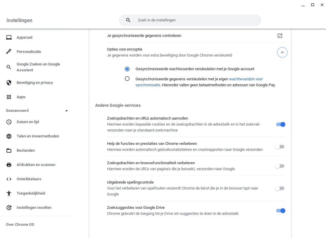 Klik in de kolom links op Geavanceerd en vervolgens – rechts – op Andere Google-services. Vervolgens is het zaak om te checken of onder Opties voor encryptie (rechts) de optie Gesynchroniseerde wachtwoorden versleutelen met je Google account aan staat (standaardselectie). Nog beter is de optie Gesynchroniseerde gegevens versleutelen met je eigen wachtwoordzin voor synchronisatie. Nadeel daarvan is dat je wel nóg weer een wachtwoord moet gebruiken. Onder de kop Andere Google Services kun je de meeste opties probleemloos uitschakelen, wel kun je eventueel de opties Zoekopdrachten en URL’s automatisch aanvullen en Zoeksuggesties voor Google Drive aan laten staan, puur voor gebruiksgemak.