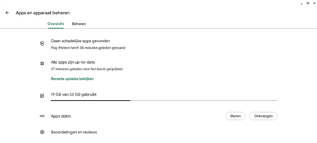 Last but not least ondersteunt Chrome OS ook Android-apps. Zorg dat die bij de tijd blijven. Doe je door Google Play te starten. Klik dan helemaal rechtsboven in het geopende venster op het bolletje met daarin bijvoorbeeld de eerste letter van je naam, een foto of avatar van jezelf (afhankelijk van wat je in je Google-account ooit hebt bedacht). Klik vervolgens op Apps en apparaten beheren en kijk of er updates klaar staan. Indien ja, dan kun je met een muisklik op de daarvoor bestemde knop allemaal updaten. Verder geldt – nu we het dan toch over Android hebben – dat je alle normale regels rondom apps daarvoor bestemd in acht moet nemen. Vermijd apps die niet tot nauwelijks gedownload en (of) beoordeeld zijn, laat wellicht ook apps van Chinese makelij liefst links liggen.