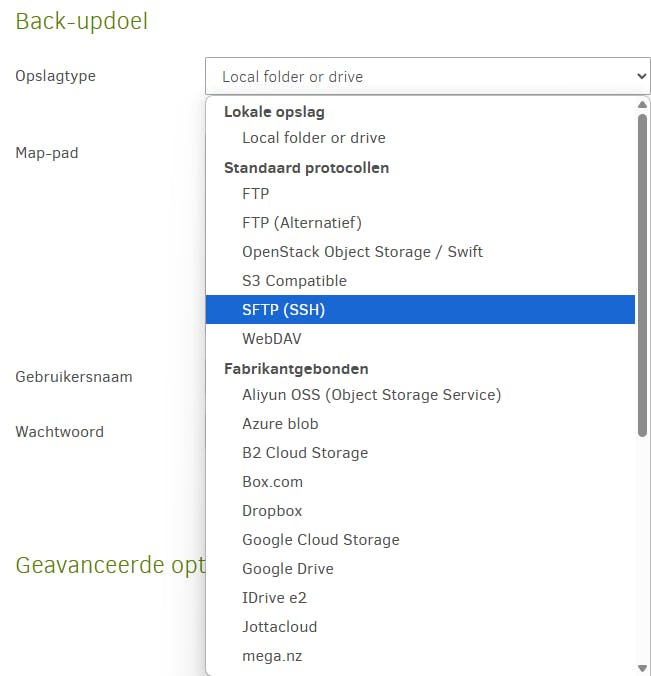 Je kunt ook rechtstreeks back-uppen naar je cloudopslag. Kies bij Back-updoel in het keuzemenu bij Opslagtype het gewenste netwerkprotocol (zoals (S)FTP of WebDAV) of een cloudprovider (zoals Google Drive, Microsoft OneDrive v2 of Dropbox).
