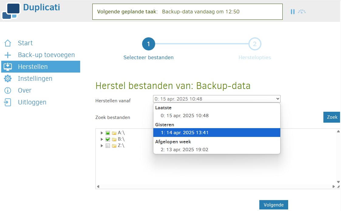 Je ziet nu de inhoud van je back-up. In het keuzemenu bij Herstellen vanaf geef je aan vanaf welke back-updatum je bestanden wilt terugzetten. Wil je bijvoorbeeld een bestand terughalen dat je op 1 mei 2025 hebt overschreven, kies dan een datum vóór 1 mei. Vink alle mappen en bestanden aan die je wilt herstellen of gebruik de zoekfunctie. Klik op Volgende en kies of je deze terugplaatst naar de originele locatie of een andere doelmap via Kies locatie. Je bepaalt ook of gelijknamige bestanden worden overschreven en of de lees/schrijfrechten van de back-up moeten gelden. Bevestig met Herstellen.
