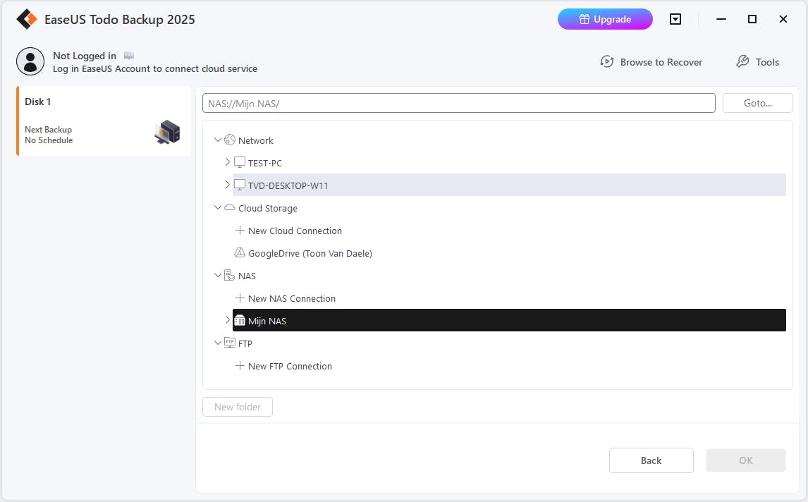 Klik op Volgende om de doellocatie in te stellen. Veiligheidshalve stel je bij voorkeur meerdere back-uplocaties in: één of twee lokale (zoals een tweede schijf of gedeelde netwerkmap) en een cloudprovider.