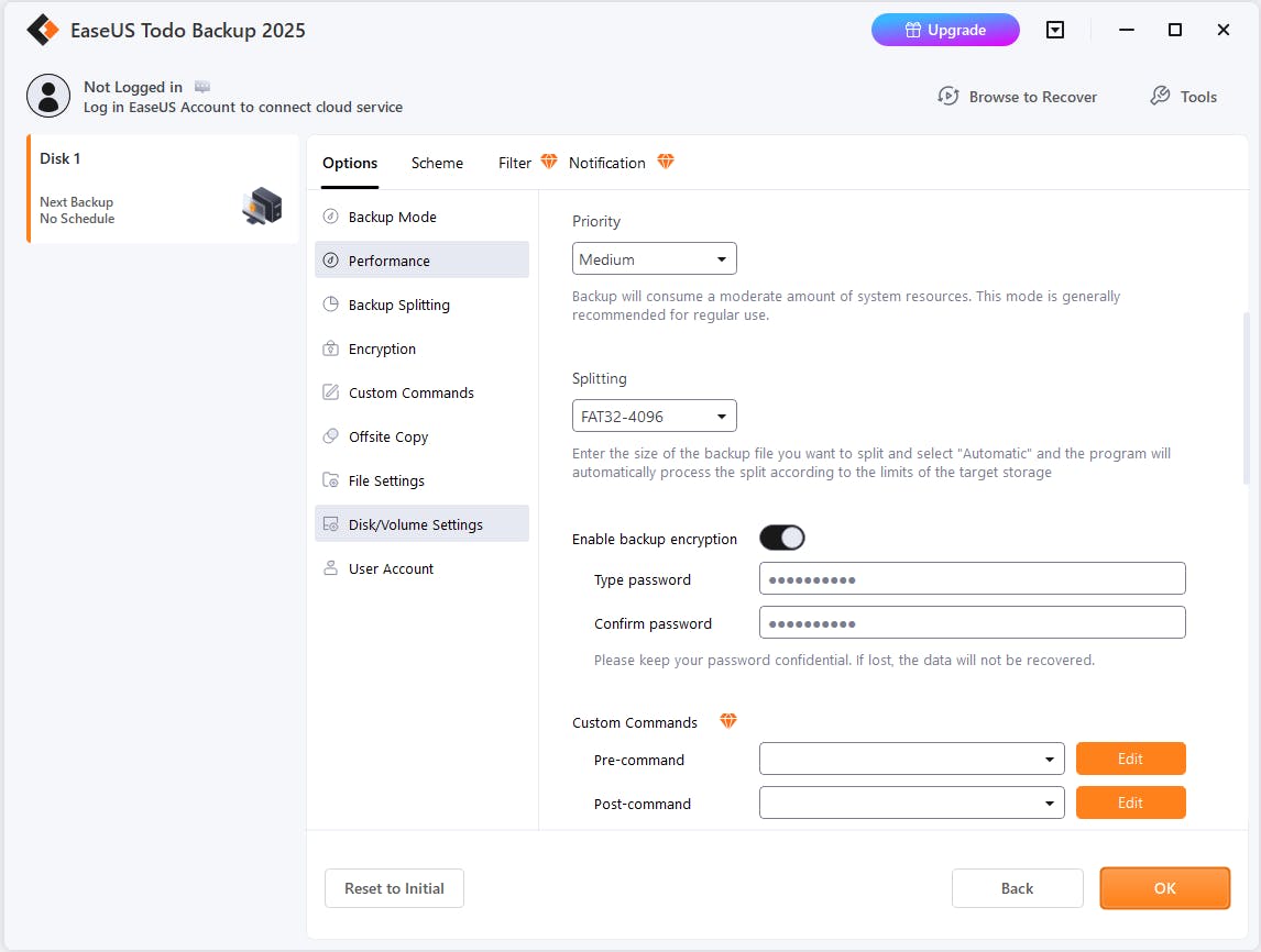 In het onderdeel Backup Splitting kun je de back-up opsplitsen. Kies je bijvoorbeeld FAT32-4096, dan wordt elk back-uponderdeel maximaal 4 GB groot, zodat het ook op een (oudere) FAT32-schijf past.