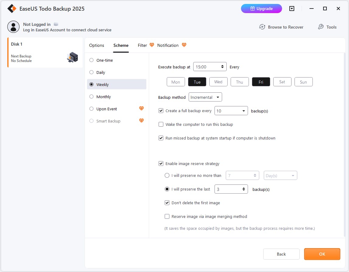 In het Options-venster vind je ook het tabblad Scheme. Hier stel je in of en wanneer de back-up automatisch moet starten. Dit is vooral handig bij bestandsback-ups, maar ook nuttig als je je schijf- of systeemback-up regelmatig wilt bijwerken. Je kunt kiezen uit onder meer One-time, Daily en Weekly.