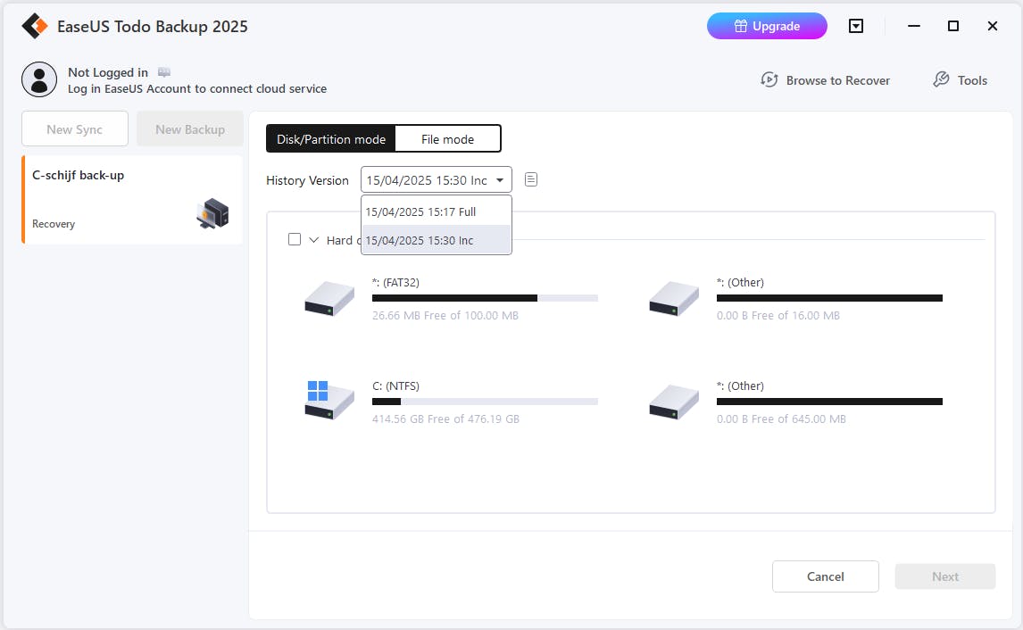 Duplicati maakt na de eerste volledige back-up (full back-up) standaard incrementele back-ups, en wanneer je back-ups plant in EASEUS ToDo Backup kun je, naast Full Backup, ook Incremental en Differential kiezen. Een incrementele back-up slaat alleen de bestanden op die veranderd zijn sinds de laatste (incrementele of eventueel volledige) back-up, terwijl een differentiële back-up alle bestanden opslaat die gewijzigd zijn sinds de laatste volledige back-up. Incrementele back-ups zijn daarom meestal sneller en kleiner, maar wel iets trager bij herstel (aangezien je alle tussenliggende back-ups nodig hebt). Bij differentiële back-ups is dat net omgekeerd.