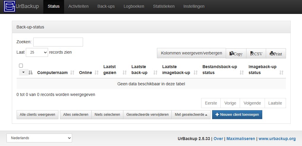 Als alles goed is, herkent de server de client automatisch en kan de back-up starten. Lukt dat niet, dan voeg je de client handmatig toe (bijvoorbeeld via het ip-adres) via +Nieuwe client toevoegen op de server.
