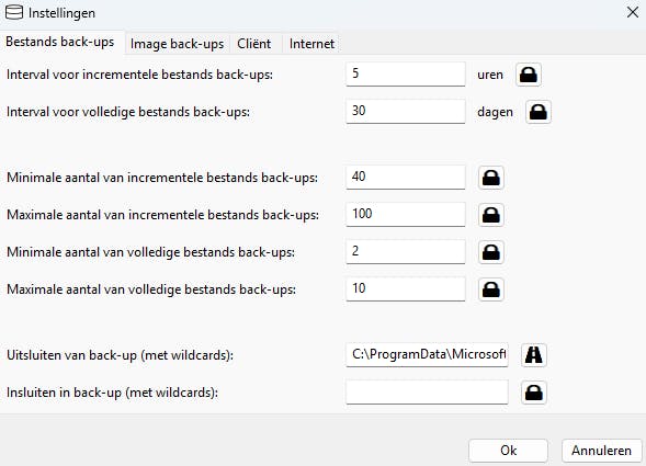 Je opent de client op elk moment met een dubbelklik op het icoon in het Windows-systeemvak. Klik er met rechts op en kies Instellingen om alle opties zoals back-upfrequentie en retentie in te stellen, op diverse tabbladen. Vanuit dit contextmenu kun je ook direct volledige of incrementele bestands- en imageback-ups starten, al kan dit net zo goed via de webinterface van de server.