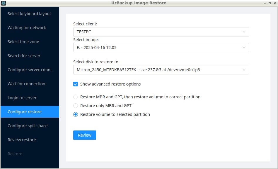 Start de client-pc op met de bootstick. Schakel indien nodig secure boot uit via het UEFI/BIOS-menu. Start vervolgens de grafische desktopomgeving, waarna UrBackup Image Restore opstart. De tool zoekt zelf de UrBackup-server in je thuisnetwerk en je kunt daarna alles correct instellen voor het herstel.