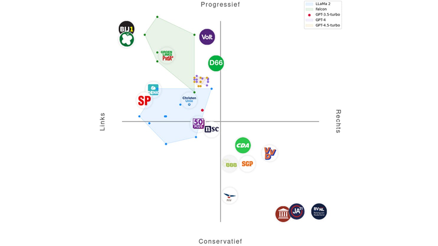 In het experiment lieten TNO en Kieskompas verschillende taalmodellen de vragen van de stemhulp van het Kieskompas 2023 meerdere malen beantwoorden. De modellen blijken niet helemaal onbevooroordeeld: ze komen uit aan de linkerkant van het politieke spectrum. Daarnaast geven ze niet consistent antwoord op subjectieve vragen en vertonen ze door kleine veranderingen in de vraag al snel heel ander gedrag.