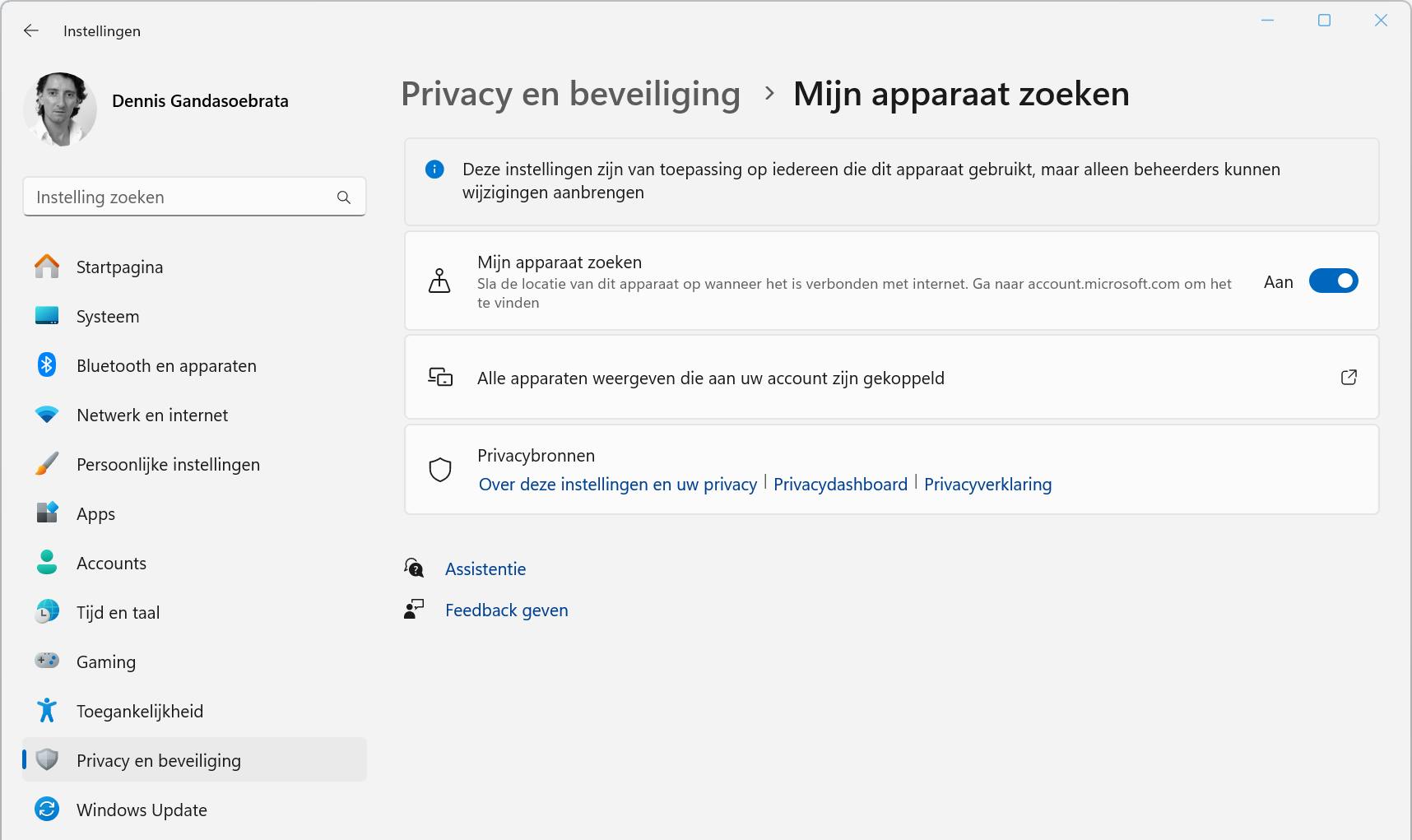 We beginnen met Windows: vooral bij het gebruik van een Windows-laptop is het verstandig om de zoekfunctie te activeren. In Windows 11 vind je de relevante instellingen via het Windows-instellingenvenster (druk op Windows-toets+I). Kies voor Privacy en beveiliging / Mijn apparaat zoeken. Om de tracering in te schakelen, zet je de schuif op Aan bij Mijn apparaat zoeken.