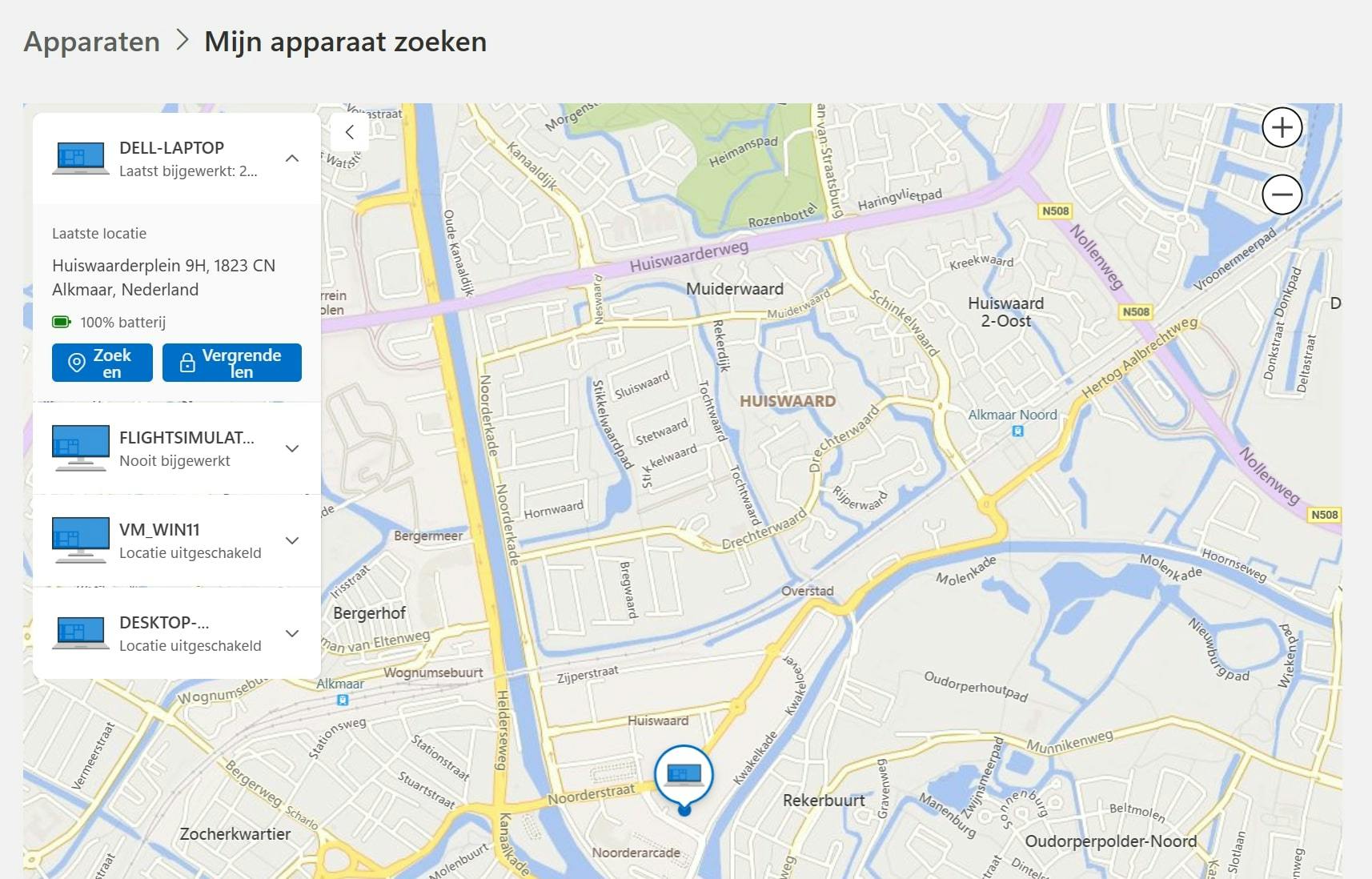 Om het apparaat te zoeken, ga je naar https://account.microsoft.com. Klik op Alle apparaten weergeven, in de sectie Apparaten. Een overzicht van aangemelde apparaten verschijnt. Zoek in de lijst naar het apparaat dat je wilt terugvinden en klik vervolgens op Mijn apparaat zoeken. Een kaart verschijnt, waarop de laatst bekende locatie van het apparaat wordt getoond. Je kunt deze functie ook gebruiken om de werking te testen. Wordt het apparaat niet gevonden? Forceer Windows om een nieuwe zoekactie te starten. In de legenda op de kaart klik je op de knop Zoeken. De locatie verschijnt op een kaart.