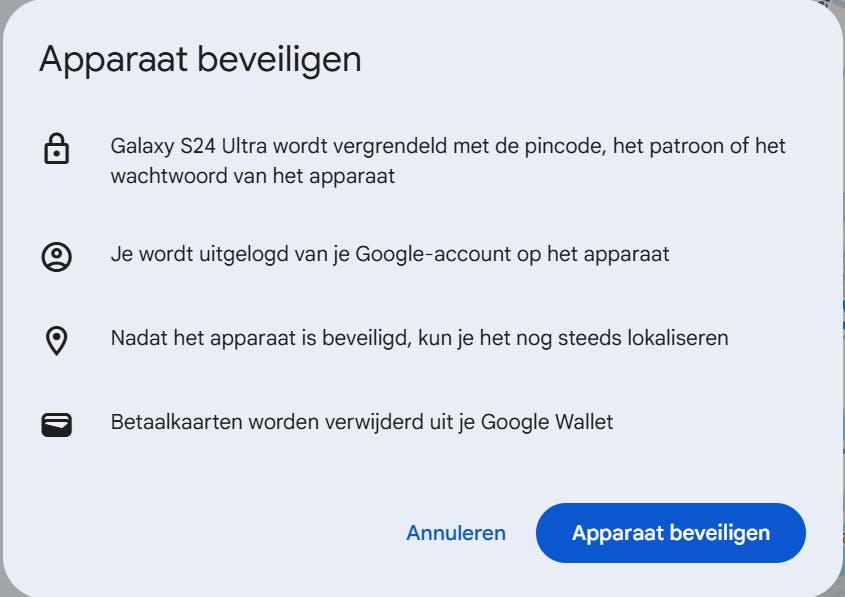 Bij serieuzere situaties is de optie Apparaat beveiligen van belang. Hiermee voer je verschillende taken in één keer uit om het apparaat beter te beschermen, bijvoorbeeld in geval van diefstal of verlies. Klik op Apparaat beveiligen. Ten eerste wordt het apparaat vergrendeld (als dit nog niet het geval is). Het kan vervolgens alleen worden ontgrendeld met een pincode, patroon of het wachtwoord dat je eerder hebt ingesteld. Bovendien wordt de gebruiker afgemeld bij een eventueel Google-account, zodat hier geen misbruik van kan worden gemaakt. Over misbruik gesproken: als je betaalkaarten digitaal hebt opgeslagen in Google Wallet, worden deze ook verwijderd. Na deze acties blijft het overigens mogelijk om de telefoon te zoeken.