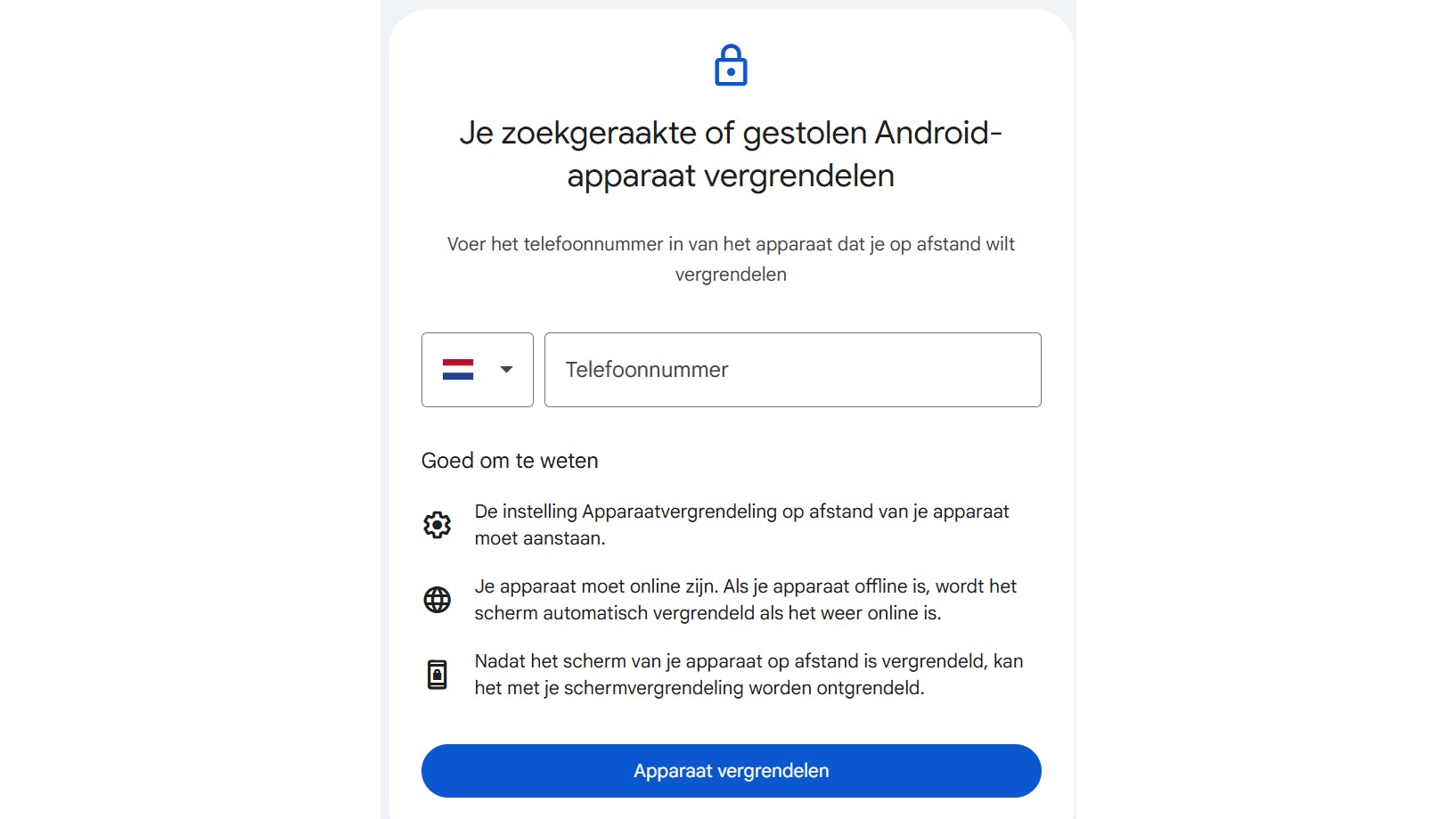 Wil je snel een van je telefoons vergrendelen, maar wordt deze niet getoond in de sectie met apparaten, dan kun je de knop Apparaatvergrendeling op afstand gebruiken. Je vindt deze rechtsboven in het venster. Geef het telefoonnummer op van het apparaat dat je wilt vergrendelen en klik op Apparaat vergrendelen. De actie werkt alleen als de optie voor apparaatvergrendeling op de telefoon is geactiveerd en als de telefoon online is. Na deze actie kun je de telefoon op elk moment weer ontgrendelen met pincode, wachtwoord of je patroon.