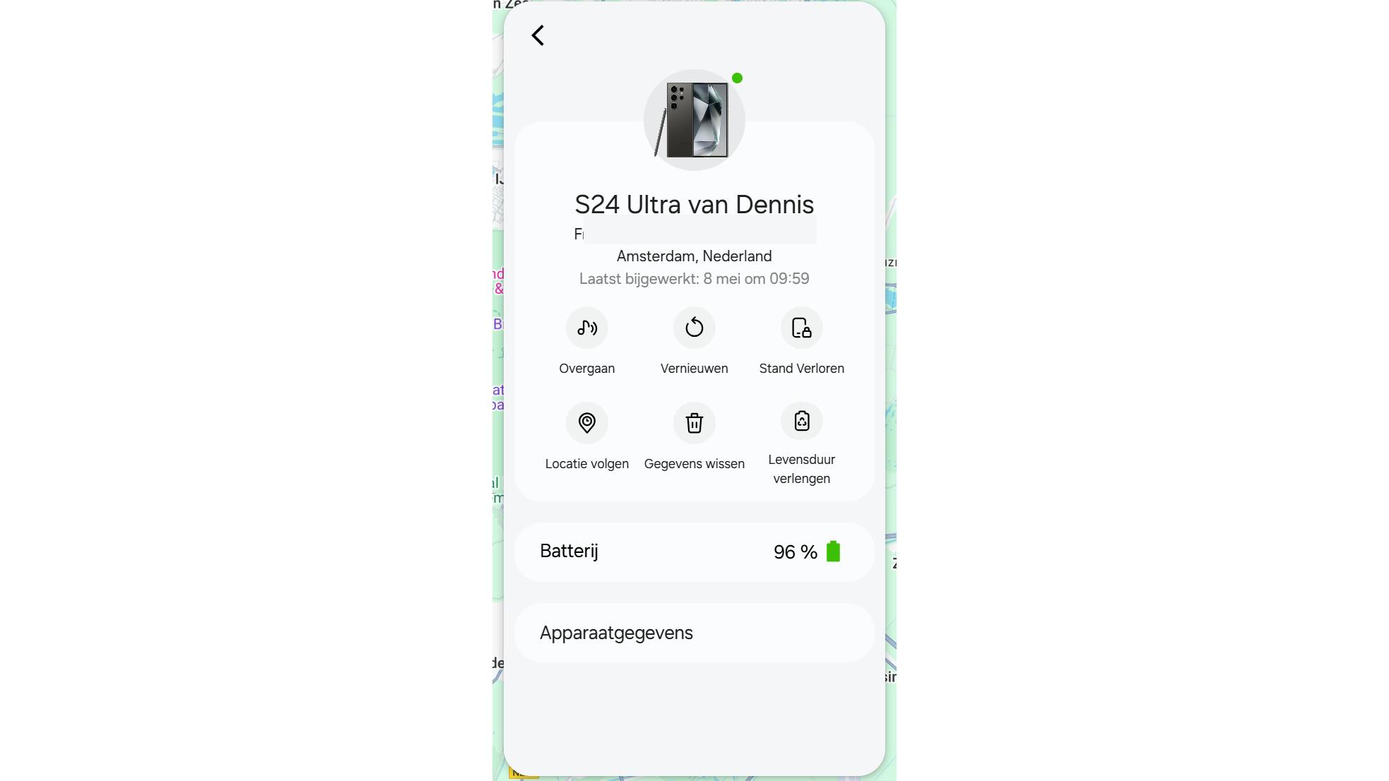Om de laatst bekende locatie opnieuw op te halen, kies je voor Vernieuwen. Dat proces kun je ook automatiseren, door de telefoon automatisch elk kwartier een update te laten sturen. Klik hiervoor op de knop Locatie volgen / Starten. Houd er wel rekening mee dat de batterij van de telefoon hierdoor eerder leegloopt en daarmee de locatie-updates eerder ophouden. Een prettige functie is Levensduur verlengen: hiermee schakel je het apparaat in een batterijbesparende stand, waarmee je de vindkans vergroot. Het accuniveau wordt overigens prominent getoond onderin het venster. Onder Apparaatgegevens vind je belangrijke informatie waaronder het IMEI-nummer terug.