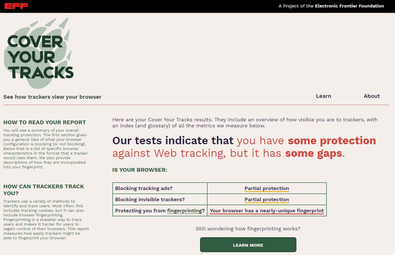 Op de website Cover Your Tracks kun je precies zien wat we bedoelen. Deze site is opgezet door de Amerikaanse digitaleburgerrechtenorganisatie EFF en vertelt je precies hoe zichtbaar je bent voor trackers. Je zult merken dat je zelfs met een VPN in een incognitovenster nog enkele identificeerbare sporen achterlaat. De meeste VPN-gebruikers kunnen dus (met wat moeite) alsnog opgespoord worden.