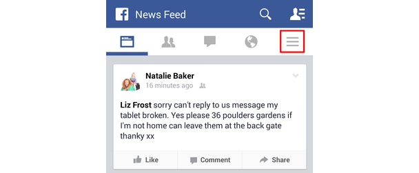 Stap 1. Open de Facebook Android-app en open het Settings menu. Om dit te doen moet je op het icoon met drie horizontale lijnen drukken, rechts bovenaan naast je News Feed (niet het icoon met drie horizontale lijnen en een silhouet; hiermee wordt Facebook Chat geopend).