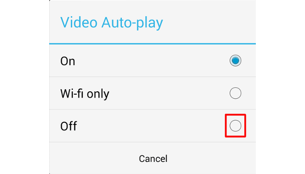 Stap 5. Deze instelling biedt drie opties: On, Wi-Fi Only en Off. Kies Off als je wilt dat video's nooit automatisch worden afgespeeld op Facebook; kies Wi-Fi Only als je niet wilt dat video's automatisch worden afgespeeld omdat je bang bent om je datalimiet te overschrijden.