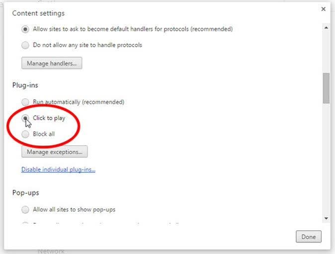 4. In het dialoogvenster dat verschijnt, zoek naar het Plug-ins-gedeelte. Selecteer Click to play, en klik op Done rechts onderaan.