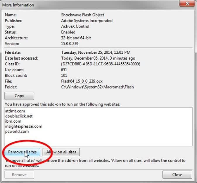 4. Klik in het More Information-dialoogvenster op Remove all sites. Sluit vervolgens alle dialoogvensters.