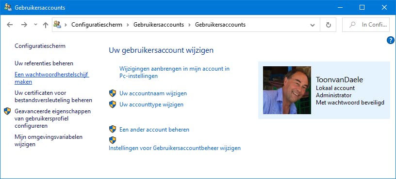 Met wat ‘geluk’ heb je ook een of meer preventieve maatregelen genomen. Zo kun je in Windows altijd nog een wachtwoordherstelschijf creëren. Stop een usb-stick in de pc, open het Configuratiescherm, kies Gebruikersaccounts (2x) en klik op Een wachtwoordherstelschijf maken, waarna je de instructies van de wizard volgt.