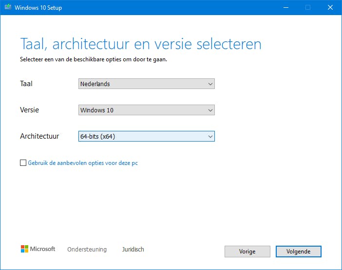 Een installatiemedium creëer je het makkelijkste via deze manier, waar je klikt op Hulpprogramma nu downloaden. Start deze applicatie en klik op Akkoord / Installatiemedia (USB-stick, dvd of ISO-bestand). Klik op Volgende en verwijder eventueel het vinkje bij Gebruik de aanbevolen opties voor deze pc als je zelf Taal, Versie en Architectuur van het Windows-installatiemedium bepaalt. Stop een (lege) usb-stick in je pc en klik op Volgende en op USB-flashstation. Selecteer je stick en bevestig met Volgende. Even later beschik je over een opstartbare usb-stick.