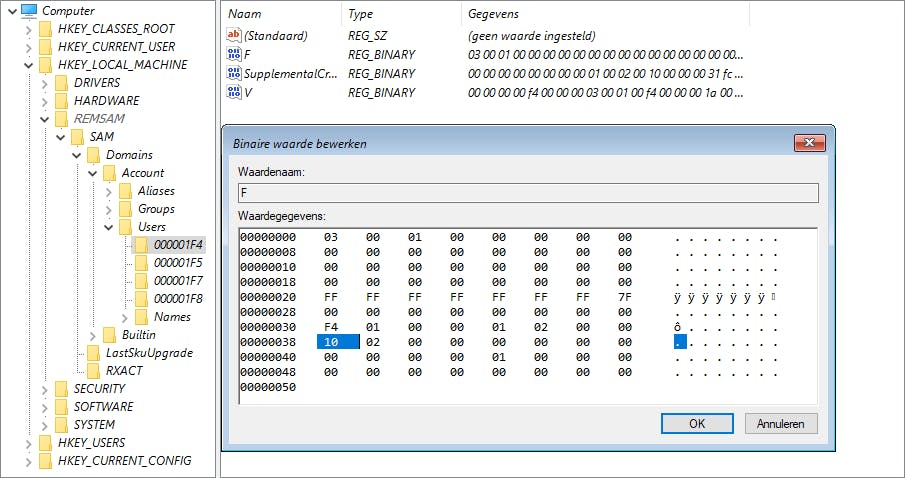 Hier voer je het commando regedit uit. In de register-editor selecteer je links de sleutel HKEY_LOCAL_MACHINE. Ga vervolgens naar het menu Bestand en kies Component laden. Klik op Deze pc en selecteer het station waarop Windows is geïnstalleerd. Navigeer hier naar de submap \Windows\System32\config. Selecteer het bestand SAM en klik op Open. Tik een willekeurige naam in en bevestig met OK. Vervolgens navigeer je in het linkervenster naar HKEY_LOCAL_MACHINE\<naam>\SAM\Domains\ACCOUNT\Users\000001F4. Open deze sleutel en klik op het item F in het rechtervenster. Klik nu op regelnummer 038 bij Waardegegevens op de waarde 11. Druk op de Delete-toets en tik nu 10 in de plaats, zodat het account Administrator geactiveerd wordt. Bevestig met OK en sluit Regedit en de Opdrachtprompt af.