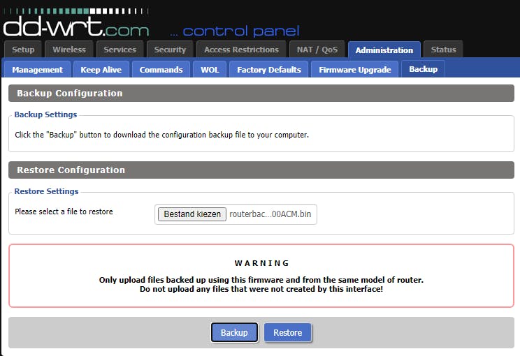 Ook het routerwachtwoord keert nu naar de standaardinstelling terug, maar daarmee verlies je helaas ook alle andere aanpassingen, zoals doorgestuurde poorten enzovoort. Tenzij natuurlijk je zo slim bent geweest om vooraf een back-up van je routerconfiguratie te maken. De meeste routers voorzien immers in zo’n handige back-up- en hersteloptie, waarna je het wachtwoord alsnog kunt aanpassen.