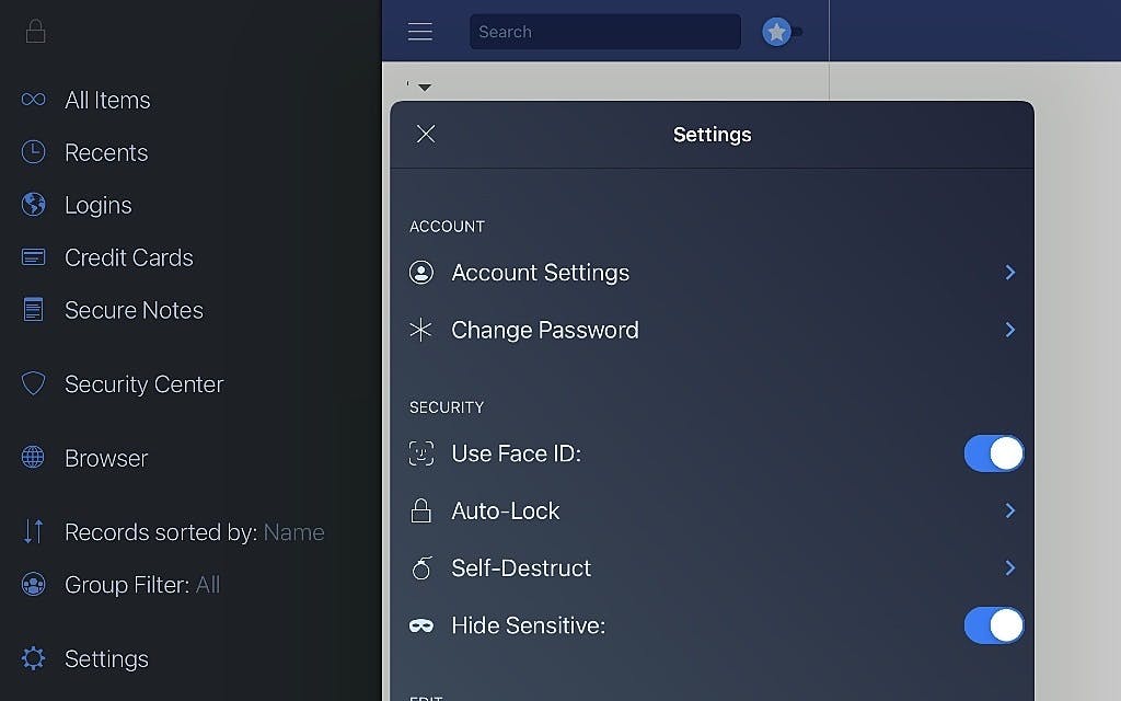 In de basis is de werking van mSecure – gelukkig – heel simpel. Als je de app voor ’t eerst start word je door het proces geleid van het opslaan van een master-wachtwoord. Het is de bedoeling dat je dat extreem goed gaat onthouden. Zonder dat kom je nooit bij je (ongetwijfeld snel groeiende) database van opgeslagen gegevens. Raak je dat master-wachtwoord ooit kwijt, dan is er geen lieve moedertje meer dat je ooit nog kan helpen. Heel belangrijk om je dat te realiseren! Heb je eenmaal een master-wachtwoord ingesteld, dan kan de pret beginnen. Wij gaan eens aan de slag met de iPadOS-versie, maar alle varianten werken zo ongeveer ’t zelfde natuurlijk. Eenmaal ingelogd met je master-wachtwoord is het – voor zover je dat niet al gedaan had – handig om voor een vingerafdruk of gezichtsscan als inlogmethode te kiezen. Mits jouw apparaat dat ondersteunt natuurlijk. Tik daarvoor in de iPadOS-versie op de knop met de drie streepjes linksboven in beeld, gevolgd door een tik op Settings. In ons geval zien we daar onder het kopje SECURITY een schakelaar achter Use Face ID. Door die aan te zetten, logt u voortaan in bij de app middels een gezichtsscan. Enig risico daarvan is, dat je nooit meer je master-wachtwoord in tikt, waardoor de kans op vergeten vergroot wordt…
