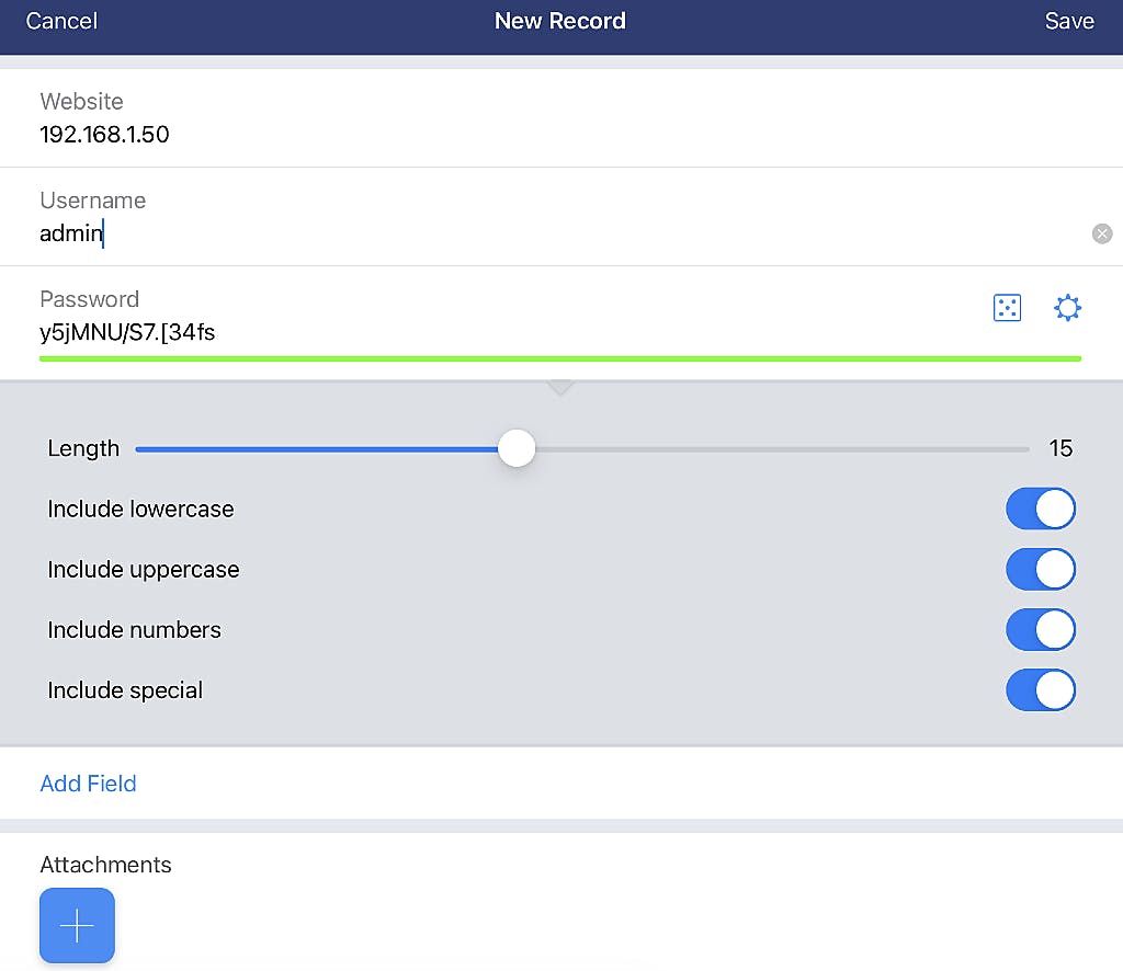 Je ziet nu een paneel waar je de gevraagde velden in kunt vullen. Je hoeft niet alles in te voeren, maar een titel voor het item, de eventuele URL van de website of het IP-adres van iets als een router, accountnaam en wachtwoord zijn min of meer minimaal noodzakelijk. Héb je al een wachtwoord voor een bepaalde dienst, dan is het zaak daar even kritisch naar te kijken. Is dat nog steeds iets als ‘Mercedes2010’, dan is het tijd om dat zo snel mogelijk voor een veilig wachtwoord te vervangen. In dat geval tik je op het dobbelsteentje en er wordt automatisch een stevig wachtwoord voor je gegenereerd. De lengte en opbouw van dat wachtwoord kun je aanpassen middels een tik op het tandwieltje. Een enkele – vaak wat oudere – website of apparaat kan soms niet overweg met ‘gekke’ tekens als {, @ of #. Die kun je hier met de betreffende schakelaar uitsluiten. Maar maak vooral gebruik van een mix van alles als jouw dienst het toestaat, dat levert alleen maar een veiliger wachtwoord op! En een karaktertje of vijftien in lengte is ook geen overbodige luxe meer.