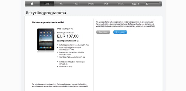 Is marktplaats niet helemaal je ding, dan kun je de tablet ook gewoon verkopen aan Apple, via het recycling programma op http://macworld.link.idg.nl/recy. Voor het hiervoor genoemde model in goede staat geeft Apple op het moment van schrijven nog 107 euro. Geen vetpot, maar als het alternatief is dat je de tablet ongebruikt laat liggen op de plank, is dat een prima bedrag. Vind je het zonde? Overweeg dan eens om je iPad weg te geven aan iemand die er écht iets aan heeft, maar er zelf nooit eentje zou (kunnen) kopen.