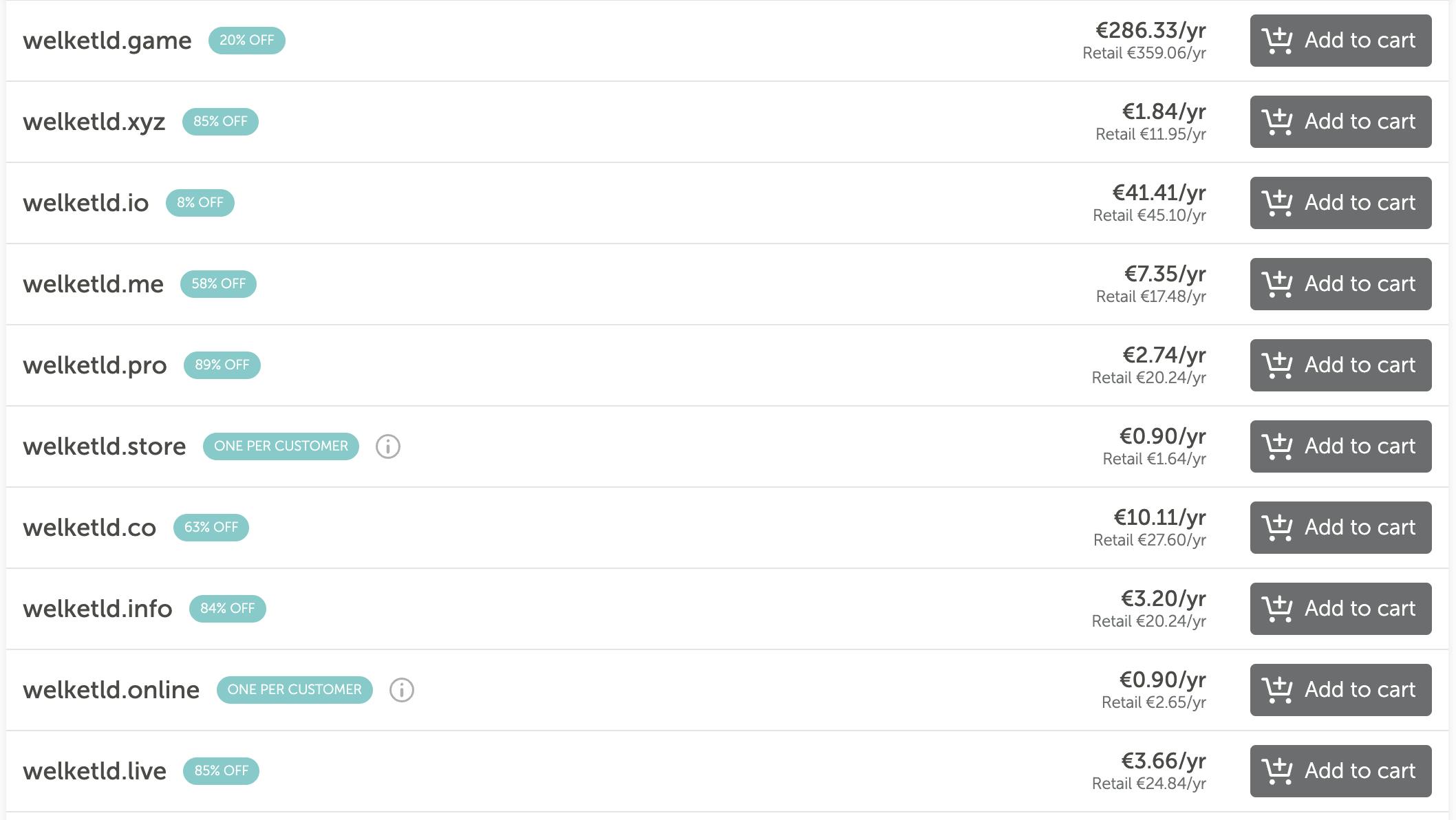 TLD's als .com en .org zijn vaak iets duurder, maar zijn alsnog relatief goedkoop. Het wordt een ander verhaal als je specifieke domeinen als .ai, .game of .xxx wilt gaan gebruiken. Daarvoor betaal je al snel ruim 50 euro tot een paar honderd euro per jaar.
