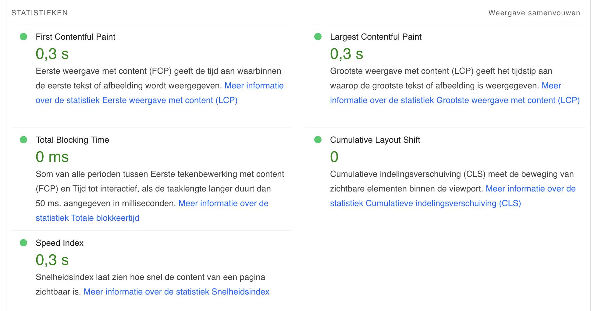 First contentful paint is het eerste moment waarop de gebruiker relevante informatie – zoals tekst, afbeeldingen of een video – ziet staan. Largest contentful paint is het moment waarop het grootste, meestal belangrijkste deel van je pagina wordt weergegeven. Total blocking time kijkt naar de tijd dat gebruikers wel iets kunnen zien, maar nog nergens op kunnen klikken vanwege scripts die nog aan het laden zijn en Cumulative layout shift behelst de plekken op je website waarbij reeds geladen gegevens opeens van plek verschuiven, omdat erboven of ernaast nog iets wordt ingeladen – iets waar Google steeds harder tegen optreedt.