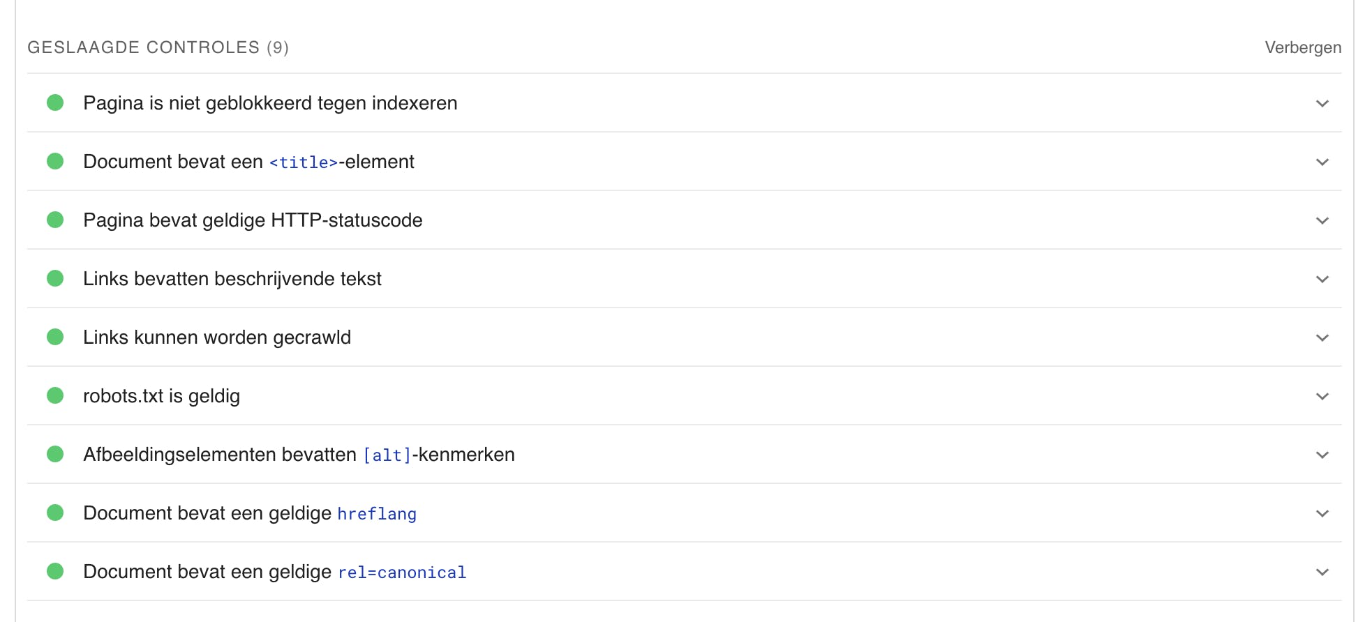 Onder het kopje Toegankelijkheid staat ook een aantal aanbevelingen, waar we nu niet op ingaan, maar die wel de moeite waard zijn even snel te checken. Onder Praktische tips vind je nog zo’n lijst, maar dan met punten die Google belangrijk vindt. Niet zozeer vanwege de snelheid of toegankelijkheid, maar om je website beter te kunnen indexeren. Loop die lijst dus ook even goed door. Hoe meer groene en witte bolletjes, hoe beter.