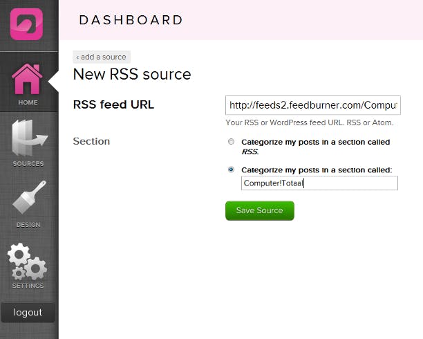 Na de registratieprocedure kunt u bronnen toevoegen aan uw tabletsite. OnSwipe kan overweg met tien populaire inhoudsbronnen: RSS, Delicious, WordPress, Twitter, Flickr, YouTube, Vimeo, Viddler, Tumblr en Instagram. Wilt u bijvoorbeeld een Twitter-feed invoeren? Klik dan op Twitter en kies vervolgens Sign in with Twitter. Geef de dienst toegang om uw account te gebruiken door op de knop Inloggen te klikken. Vervolgens wordt u teruggestuurd naar het OnSwipe-dashboard. U kunt nu nog kiezen in welke sectie u de tweets wilt zien verschijnen. Klik op Save source om de instellingen te bewaren. Op dezelfde manier kunt u ook RSS-feeds van iedere willekeurige pagina toevoegen als bron. Klik op RSS, voer de url van de RSS-feed in, wijzig eventueel de rubriek en klik tot slot op Save Sources. Wanneer u in het OnSwipe Dashboard op de Home-knop in de linkerkolom klikt, krijgt u een overzicht van de toegevoegde bronnen. Houd uw cursor boven een bron en klik op Edit Source om deze eventueel aan te passen.