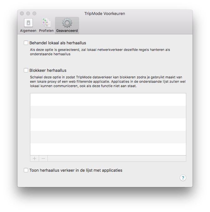 Onder Geavanceerd vind je nog een interessante functie, al is door de gebrekkige vertaling niet geheel duidelijk wat er mee wordt bedoeld. Zet je het vinkje voor Behandel lokaal als herhaallus aan, dan telt TripMode verkeer dat van je computer naar een andere computer in je netwerk wordt verstuurd en ontvangen als loopback traffic. Meer informatie over dit concept vind je in de handleiding of op de website.