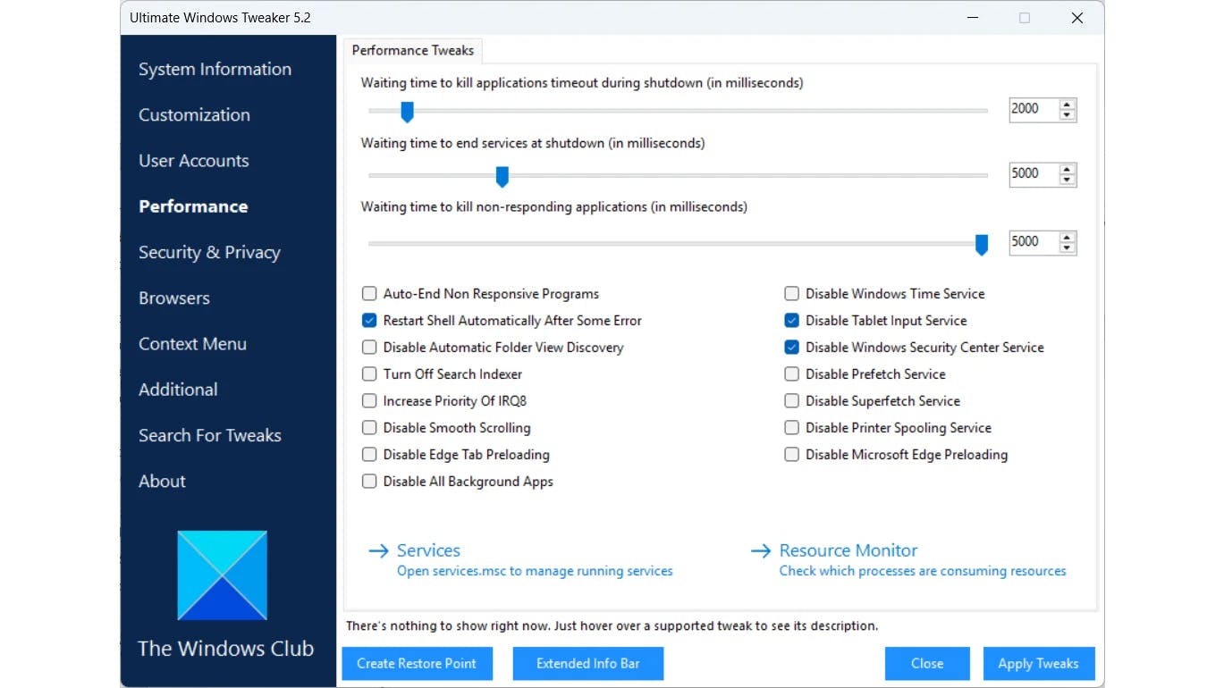 Veel gebruikers hopen dat tweaktools hun pc spectaculair sneller maken. Ultimate Windows Tweaker is daar eerlijk in, wonderen bestaan niet. Wat de tool wél doet, is onnodige ballast verminderen. In de categorie Performance kun je achtergrondprocessen en systeemgedrag verfijnen, bijvoorbeeld door bepaalde visuele effecten zoals Smooth Scrolling te minimaliseren. Daarmee kies je bewust voor prestaties in plaats van uiterlijk. Op oudere of minder krachtige systemen kan dat het verschil maken. Voorzichtigheid blijft wel geboden. Sommige instellingen lijken overbodig, maar blijken in de realiteit cruciaal voor specifieke functies. Ultimate Windows Tweaker geeft meestal aan wat iedere tweak doet, maar gezond verstand blijft nodig.