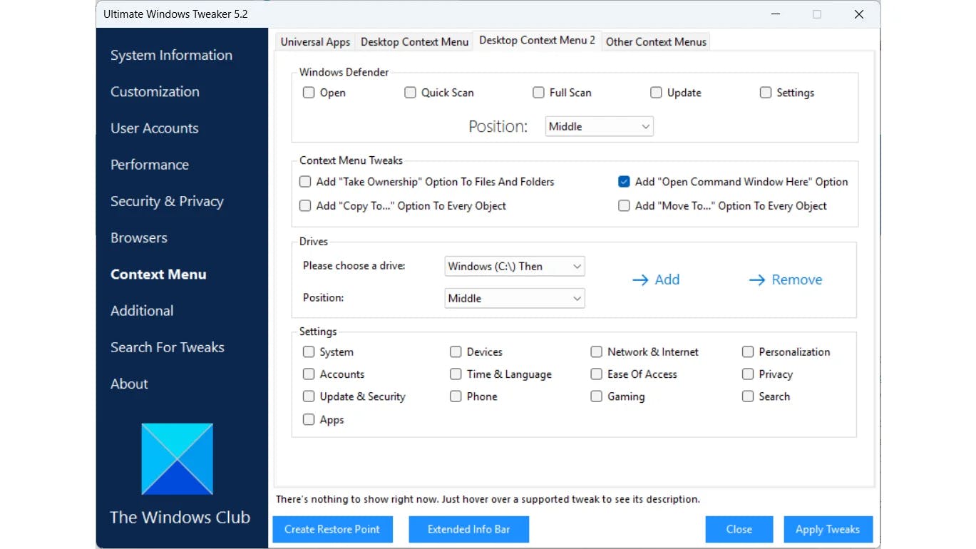 De categorie Context Menu in UWT 5.2 draait niet om één klassiek menu, maar om het gericht aanpassen van verschillende contextmenu's in Windows 11. De instellingen zijn onderverdeeld in vier tabbladen, elk voor het gebruik van het contextmenu in verschillende situaties.