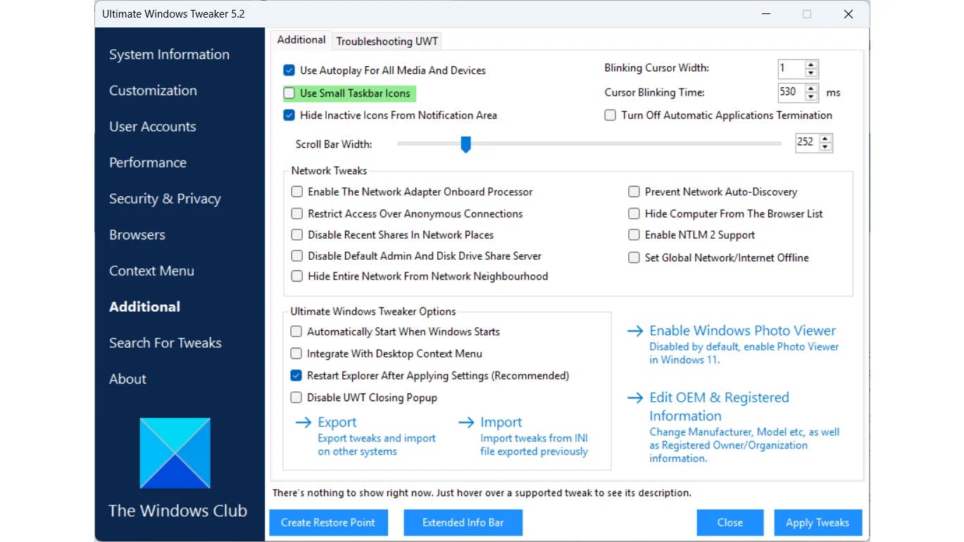 De categorie Additional is een soort grabbeldoos met twee tabbladen van extra instellingen die nergens anders logisch onder te brengen zijn. In het eerste tabblad vind je tweaks die bijvoorbeeld de breedte van de scrollbalk bepalen of de snelheid waarmee de cursor knippert. Hier zit ook een sectie netwerktweaks. Het tabblad Troubleshooting UWT biedt oplossingen voor problemen met UWT zelf. Bijvoorbeeld wanneer een gekozen tweak het niet doet, of wanneer het niet lukt om vanuit UWT een herstelpunt te maken.
