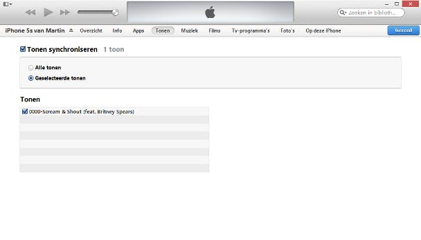 Ga nu terug naar het hoofdoverzicht van iTunes (dus je muziekbibliotheek op je pc of Mac) en sleep het m4r-bestand naar iTunes, waarna het automatisch als ringtone wordt herkend. Navigeer nu weer naar je iPhone in iTunes en klik op het tabblad Tonen, alwaar je een vinkje zet bij Synchroniseren. Wanneer je nu synchroniseert wordt je ringtone automatisch tussen de andere ringtones geplaatst en kun je deze selecteren.
