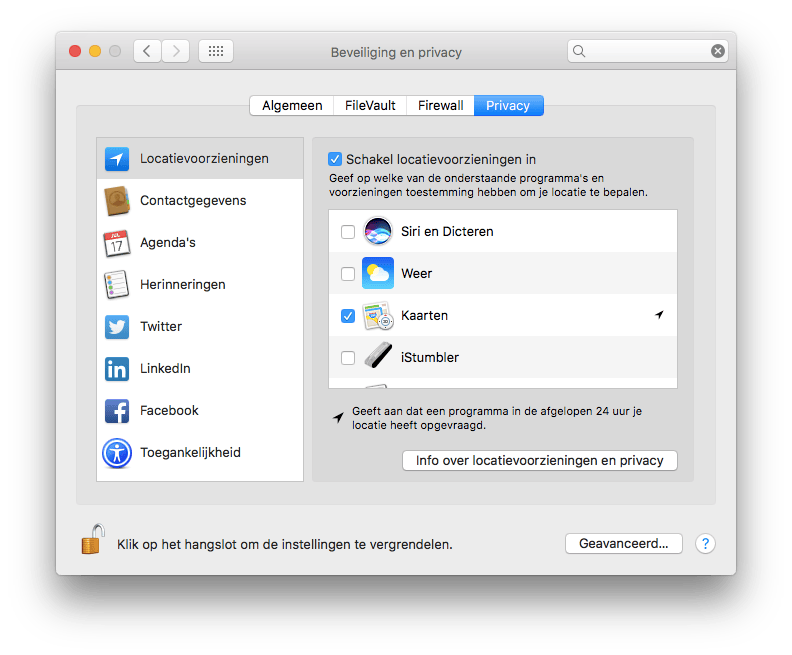 Ga naar Systeemvoorkeuren > Beveiliging en Privacy en klik op het tabblad Privacy. Klik vervolgens op Locatievoorzieningen.
