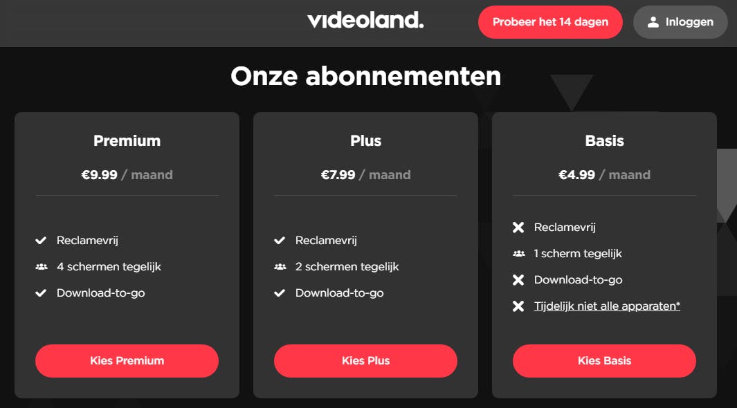 Abonnees van Videoland hebben keuze tussen een Basis-, Plus- en Premium-account. Een Basis-lidmaatschap kost slechts vijf euro per maand en biedt volwaardige toegang. Bedenk wel dat dit abonnement één gelijktijdige stream toestaat en reclame bevat.