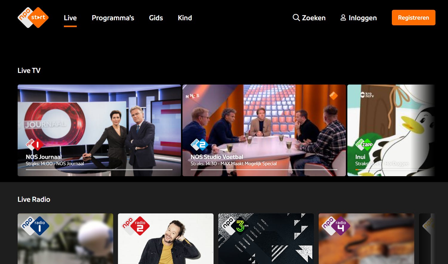 Kijk je voornamelijk naar uitzendingen van de publieke omroepen? In dat geval heb je aan de gratis NPO Start-app genoeg, want hiermee ontvang je NPO 1, 2 en 3. Bovendien heb je hiermee ook toegang tot verschillende themakanalen, waaronder NPO Nieuws en NPO Politiek. Surf met een computer naar www.npostart.nl/live en klik op een zender om de liveweergave in een browser te starten. Verder bestaat er voor Android- en iOS-toestellen een mobiele app.