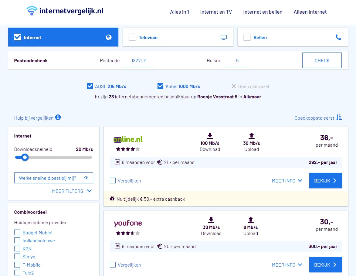 Kijken meerdere gezinsleden vaak tegelijkertijd 4K-films of spelen ze geregeld zware netwerkgames? In dat geval loont het de moeite om naar een internetabonnement met een snelheid tot 50 of zelfs 100 Mbit/s te kijken. Gelukkig zijn dergelijke abonnementen ook prima betaalbaar. Overigens hanteren sommige aanbieders voor nieuwe abonnees het eerste halfjaar een lager maandtarief, zoals Online.nl, Youfone, Oxxio en Tele2. Het loont dus de moeite om regelmatig van internetprovider te switchen.