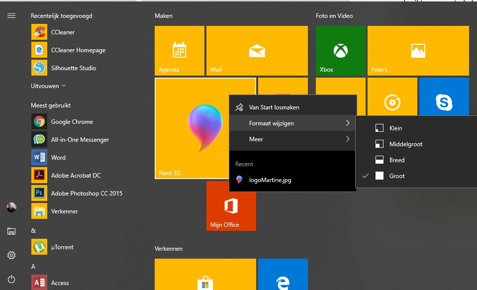 Er was een tijd waarin we niet heel veel invloed hadden op het uiterlijk van het menu Start. Dat is in Windows 10 wel anders, maar toch maken we er met z’n allen veel te weinig gebruik van. Klik eens op het menu Start, en kijk er eens goed naar. Je zult zien dat er allerlei onderdelen in staan die je niet gebruikt, terwijl onderdelen die je wél gebruikt nergens te bekennen zijn. En dat terwijl het zo eenvoudig is om dat menu aan te passen. De titels van de segmenten pas je aan door op het pictogram met de twee streepjes te klikken naast de titel. Een tegel die je niet gebruikt, verwijder je door te rechtsklikken op de betreffende tegel en te klikken op Van Start losmaken. Een programma toevoegen doe je door in het menu Start naar het programma te zoeken, te rechtsklikken op het gevonden pictogram en te kiezen voor Aan Start vastmaken. Je kunt het pictogram vervolgens eenvoudig naar het gewenste segment slepen. Sleep je het pictogram op een ander pictogram, dan wordt er een mapje aangemaakt. Door te rechtsklikken op een tegel en te kiezen voor Formaat wijzigen kun je de tegel prominenter maken.