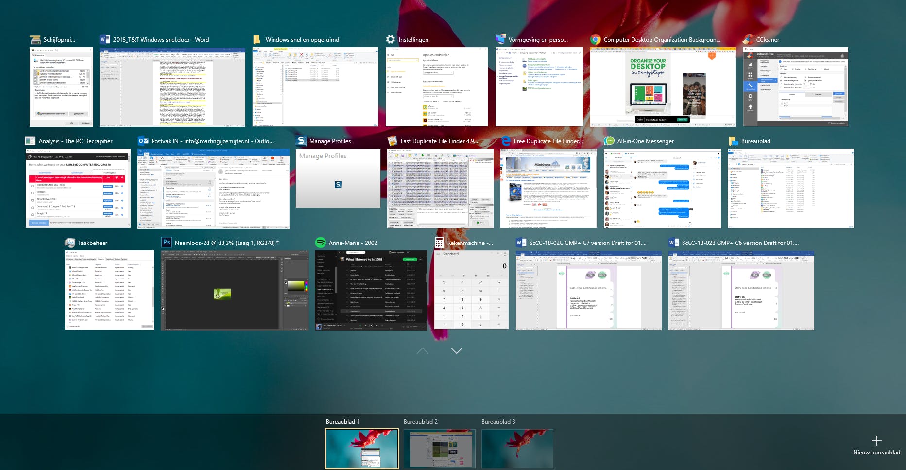 Tot slot nog een laatste visueel hulpmiddel om ervoor te zorgen dat Windows wat overzichtelijker en georganiseerder voor je wordt. Sinds de release van Windows 10 hebben we ook in Windows eindelijk de mogelijkheid om gebruik te maken van virtuele bureaubladen (Mac en Linux hadden die mogelijkheid al veel langer). Deze functie is superhandig als je veel verschillende dingen doet. Wanneer je bijvoorbeeld Facebook wel open wilt hebben staan maar niet wilt dat je wordt afgeleid wanneer je andere dingen aan het doen bent, dan komt deze functie goed van pas. Je kunt daarvoor namelijk verschillende bureaubladen aanmaken, waarbij jij bepaalt welk venster in welk bureaublad komt te staan. Zo kun je dus een bureaublad hebben waarin allerlei productiviteitsapps zijn geopend, een bureaublad met dingen die je doet in je pauze enzovoort. Je maakt een bureaublad aan door in de taakbalk op het pictogram te klikken dat nog het meeste lijkt op een pleister (Taakweergave, vlak naast de knop Start). Onderin zie je een bureaublad, en aan de rechterkant een plusteken. Klik hierop om meer bureaubladen toe te voegen. Je kunt nu eenvoudig de geopende vensters naar het gewenste bureaublad slepen.